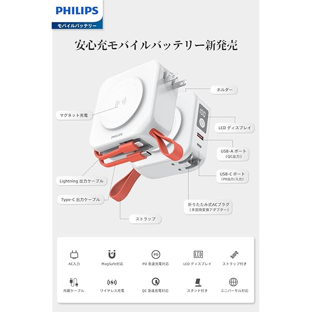 【PHILIPS多機能モバイルバッテリー】 最大出力22.5WのUSB-A出力ポートとPD急速充電に対応したUSB-C入出力ポートを搭載し、ライトニングケーブルとタイプcケーブルも内蔵し、さらにマグネット式ワイヤレス充電にも対応した10-in-1のコンセント一体型多機能モバイルバッテリーでございます。 最大5台のデバイスを同時に充電できるので、iOSでもAndroidでも便利な充電体験を楽しむことができます。