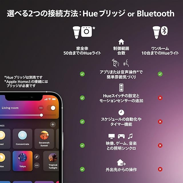 【家全体の照明コントロールに最適】 家全体の照明をコントロールする場合は、Hue ブリッジを使うことで、最大50個の照明を安定して確実な操作を実感いただけます。例えば、外出時に家中の照明を一括消灯できたり、1階に居ながら2階の照明操作ができます。