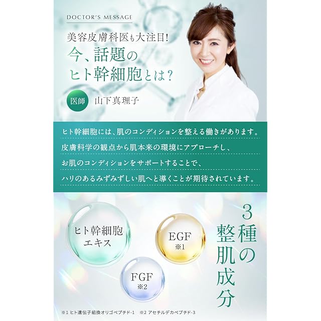 今、大注目!美容皮膚科医も大注目の高純度「ヒト幹細胞培養液」を厳選配合。皮膚科学から生まれた次世代スキンケアを体感して下さい。ヒト幹細胞のチカラを最大限にするため、EGF、FGFを贅沢に配合しています。