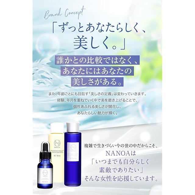 ゆらぎ肌成分としてCICA(シカ)、バクチオール、ドクダミエキス、グリチルリチン酸2Kを配合。さらにビタミン成分としてビタミンA誘導体(レチノール()、ビタミンC誘導体を配合。ゆらぎ肌ケア×ビタミンのダブルチカラでしっかり美肌メンテ。 ヒアルロン酸、ビタミンC誘導体、セラミド、フラーレン、コラーゲン、プラセンタを配合し、NANOAは理想的な保湿力にこだわりました。