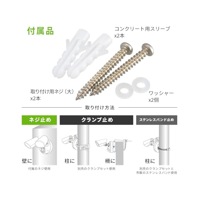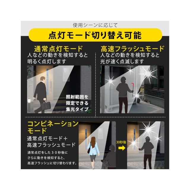 【 特 長 】 ◆強力な明るさ、2000ルーメン ◆高速フラッシュ点滅で不審者に警告、不審者の存在を周囲に知らせます ◆使用シーンに応じて点灯モード切り替えができます・ 通常点灯モード…人などの動きを感知すると明るく点灯します(点灯時間は約5秒/2分/5分調節可能)・ 高速フラッシュモード…人などの動きを検知すると光が速く点滅します・ コンビネーションモード(通常点灯モード+高速フラッシュモード)…通常点灯をした30秒後にさらに動きを検知すると、高速フラッシュに切り替わります ◆検知範囲は最大約120°、最長約7m ◆光源色は昼光色 ◆保護等級はIP44の防じん防まつ形 ◆取り付け方法はネジ止め、クランプ止め、ステンレスバンド止めの3通り ◆コンセント式