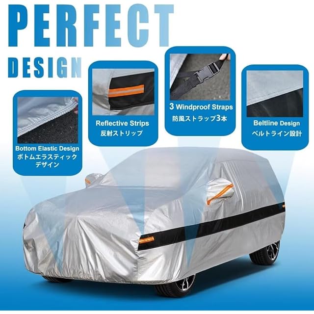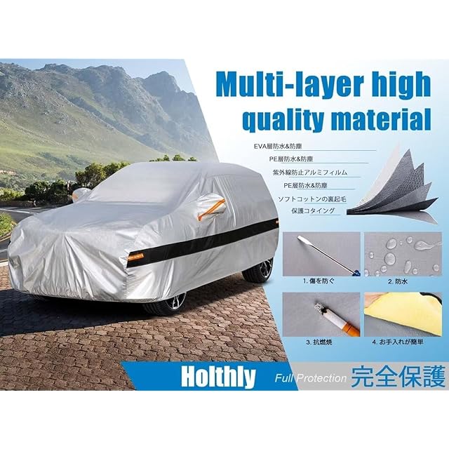 〖アップグレード素材〗-1:大型車カバーは10層複合材でできています。2:銀の表面は日光の反射とUV保護に優れており、暑い夏に車内の温度を効果的に下げます。3:内部の厚手の綿は、車のカバーの堅牢性を高め、引き裂き止めと傷のつきにくい能力を向上させます。