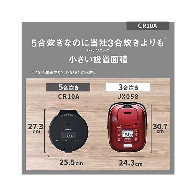5合炊きなのに当社3合炊き(※)より小さい設置面積。「コンパクト設計」なのに「圧力」でふっくらおいしく。 ※2018年発売SR-JX058(幅24.3×奥行30.7cm)