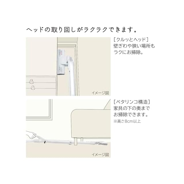 ヘッドが浮かずに家具の下の奥までお掃除できる。 [ぺタリンコ構造]