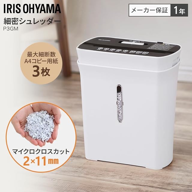 アイリスオーヤマ 家庭用 シュレッダー マイクロクロスカット 細断枚数3枚 ホチキス対応 連続使用3分 ダストボックス8.9L A4/120枚収容 コンパクト 小型 細密 家庭用 オフィス テレワーク 在宅P3GM ホワイト
