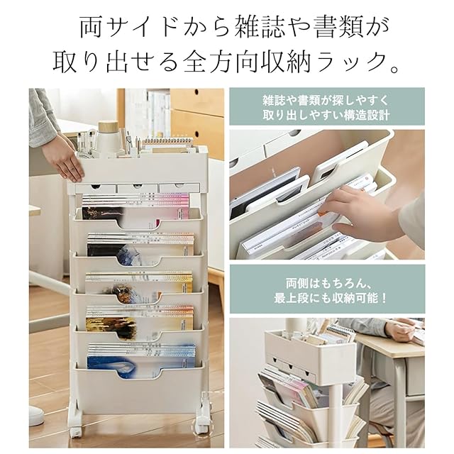 【色々なシーンに使える多機能スリムワゴン】 ご家庭だけでなく、コンビニや喫茶店などに置いて雑誌や新聞などを置いてお客様に読んでいただける収納ラックです。 学校の教室や寮などにも置けます。 自宅の書斎やリビングルーム・キッチンにも最適です。そして、絵本棚、オフィス、子供部屋、学生寮、日常収納ラックなどとしても◎