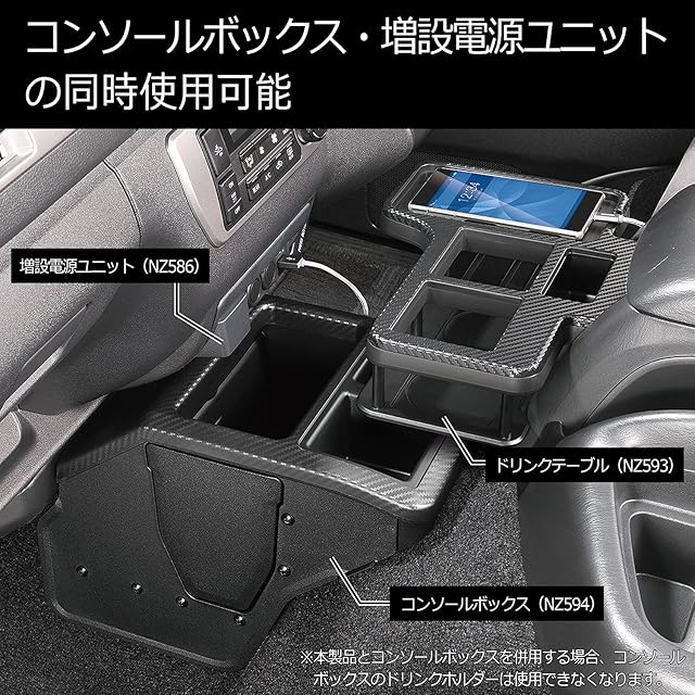 【注意】 ・本製品は純正のセンターコンソールボックスの前面トレイ部に取り付けるため、センターコンソールボックスがない車両(フロントシートが3人掛け仕様の車両)には取り付けできません。 ・ワイドボディ仕様車の場合、純正灰皿が取り外せなくなります。 ・車両内装のばらつきによってエンジンカバー開閉時にインストルメントパネルに接触する場合があります。 ・本製品とカーメイト製コンソールボックス(品番:NZ534・NZ594)と併用した場合、コンソールボックスのドリンクホルダー部は使用できなくなります。