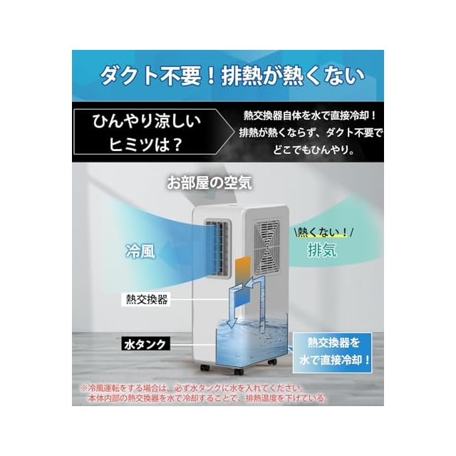 ✅【ダクトレス!排熱の温度を下げるスポットクーラー】より快適にお使いいただけるよう、夏の新家電“ダクトレス”クーラーを開発!従来のスポットエアコンと比べて、窓パネル・排熱ダクト設置が不要で、しっかり冷えた空気を送りながらも、タンクに入った水のチカラを利用して熱交換器自体を冷やすことで、排気の温度を抑えることもできます。置くだけだから工事不要!エアコンが設置できない環境の強い味方「ポータブルクーラー」。エアコンが使えない場所やちょっと涼みたい時、お風呂上りのクールダウンに役立つスポット冷風。