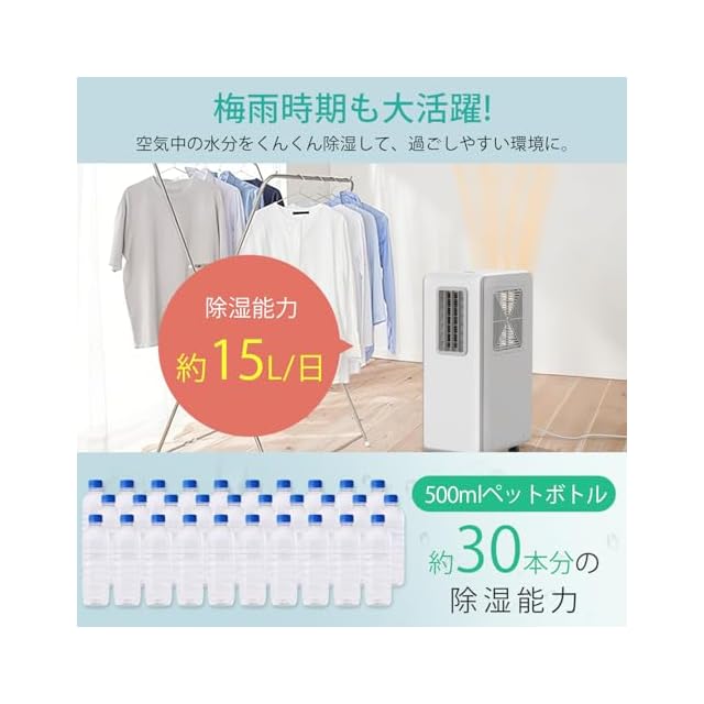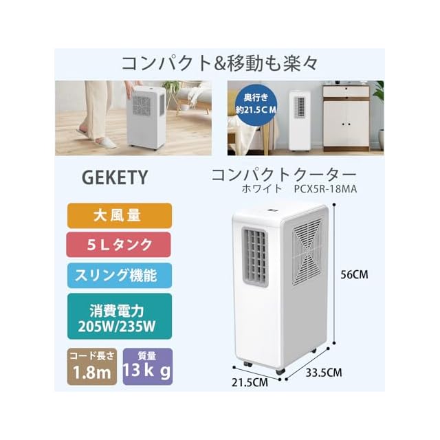 ✅【除湿能力15L/日・省エネ・夏場や梅雨時期も大活躍!】1日あたり最大約15Lの除湿能力を持ち、湿度があがる夏場や部屋干しのサポートに役立つ除湿運転。湿度が高くなりやすい梅雨の時期も、パワフルな除湿で快適な空間を保ちます。コンプレッサー式だから30~90%まで湿度が細かく調節可能なので、広いリビングルームも、閉めきりがちなクローゼットもお得に強力除湿。さらに、洗濯物に風があたりやすい可動ルーバー設計で、部屋干し衣類などを効率的に乾燥。生乾きのニオイ対策にも役立ちます。省スペース設計で、クローゼットや脱衣所、玄関など、湿気が溜まりやすい狭い場所でも活躍します。GEKETYスポットクーラーは、エアコンのように部屋全体を冷やすのではなく、特定の場所を冷やすため、エアコンよりも消費電力を抑えることができます。特に、消費電力205W/235W (50/60Hz)と小さく、夏の電気代を安く抑えたい方におすすめです。