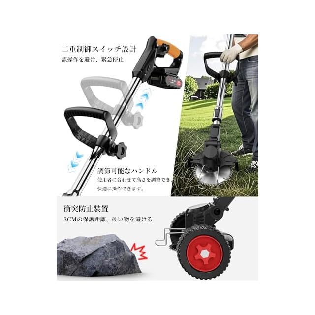 二重制御スイッチ設計で安全性向上:芝刈り機 充電式には二重制御スイッチが搭載されており、ハンドル部分に2つの黒いボタンを同時に押すことで起動します。片方のボタンを離すと即座に停止するため、誤作動を防ぎます。また、草や破片の飛散から操作員を保護する防護カバーや、障害物との衝突を防ぐバンパーが装備されており、安全性がさらに向上しています。これにより、効率的で安全な作業が可能になります。