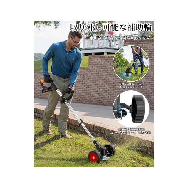 可分解式の補助ホイールと4種類の切断ブレードを搭載:芝生が比較的平坦な場合は、補助輪の装着をおすすめします。安定性が向上し、効率よく草刈りが行えます。この設計は、草刈り機により高い安定性と柔軟性をもたらすことを目的としています。さらに、充電式草刈り機には交換可能な複数のブレードが付属しており、庭園、芝生、雑草地など、さまざまな環境で簡単にご使用いただけます。パッケージ内容:充電式草刈り機本体1台、大容量バッテリー2個、ナイロンコードカッター5個、ナイロン製ブレード10片、スチールブレード5片、チップソー3片、ホイール1セット、防護カバー1個、衝突防止バー2個、手袋1双、メガネ1双、充電器1個、ドライバー2本、取扱説明書1冊。