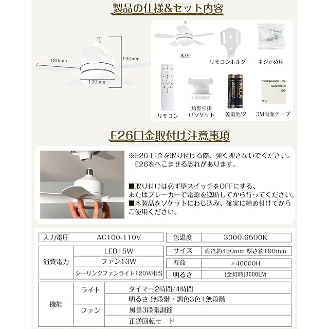 【商品仕様&パッケージの内容】 ◆ミニサイズ:45*45*19cm, 673g ◆素材:高品質ABS+PC ◆使用寿命:≥20000H ◆操作方法:リモコン操作◆LED全光束:約3000LM◆照明面積:6畳~8畳◆風量:120W相当超高速風速 ◆低騒音:≤30dB ◆3色温:3500k-6500k ◆調光調色:無段階調整可能 ◆タイマー機能:2・4H ◆使用環境:室内/乾燥 ◆パッケージの内容:シーリングファンライト本体*1、角型引掛ランプソケット*1、リモコン*1、リモコンケース*1、リモコン用単4形乾電池(お試し用)*2、日本語説明書*1。