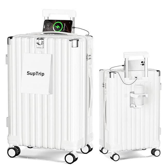 [SupTrip] スーツケース 機内持ち込み 多機能 キャリーケース 大型 超軽量 キャリーバッグ 耐衝撃 USBポート付き カップホルダー付き 充電機能 荷物フック 隠しフック機能 静音 ダブルキャスター 360度回転 修学 泊まる 旅行 出張 (ホワイト, XL (78L/7-10泊))