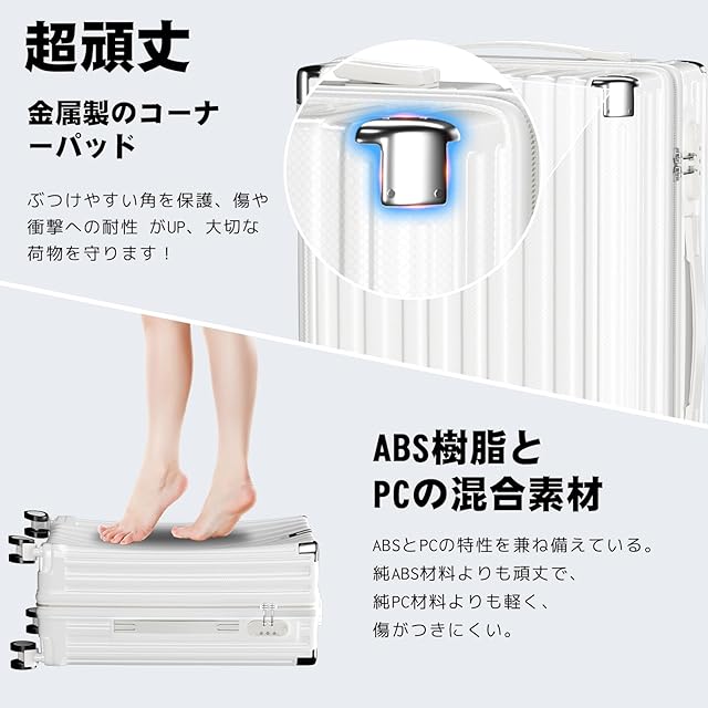 【軽量で頑丈なABS+PCボディ】 本体は軽量性と耐衝撃性に優れたABS樹脂とPCの複合素材を採用。女性でも楽に持ち上げられる重さです。表面に施された無数の微細な凹凸模様が傷つきを防止し、さらに四隅にアルミニウム合金製メタルガードを4ヶ所配置。耐衝撃性能を向上させることで、スーツケースの耐久性をさらに高めています。