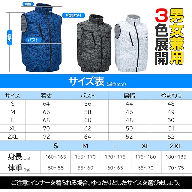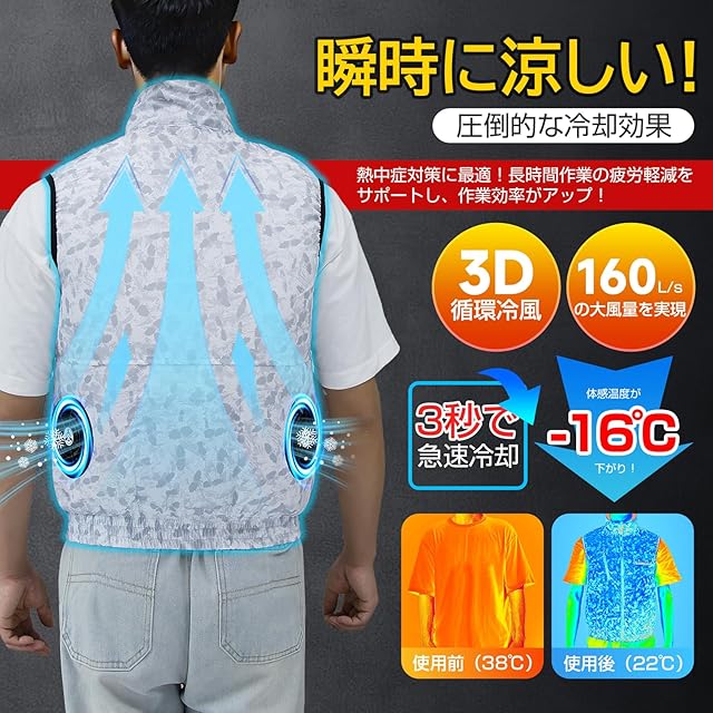 【スタイリッシュなデザイン&男女兼用】この扇風機ベストは、スタイリッシュな迷彩デザインが特徴で、個性的な印象を与え、男女問わず快適に着用できます。3色、5サイズのバリエーションから選べます。特に建設作業員や屋外作業の方、野外探検家など、さまざまなシーンで活躍します。ご使用中にご不明な点がございましたら、いつでもご連絡ください。
