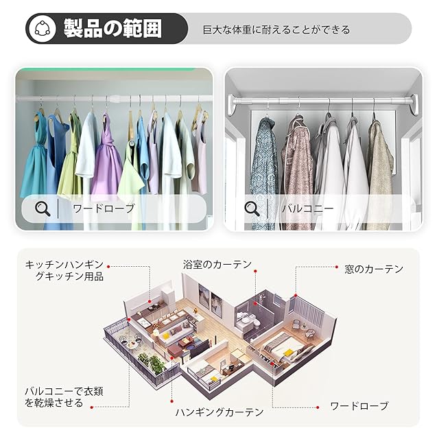 【空間を有効活用】突っ張り棒は自由に長さが調節でき、違う場所に合わせて取り付けられます。収納力拔群で、場所を取らないです。使用しない時に取り外すことも可能です ,つっぱり棒、クローゼットロッド、室内カーテンロッド用、浴室タオル掛け用、風呂場シャワーカーテン用、部屋干し用、洗濯干し、布団干し、キッチン用品収納。
