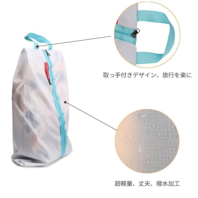 超軽量&撥水加工:超軽量ナイロン素材を使用し、わずか50gの軽さで負担を軽減し、持ち運びに便利です。撥水機能を持ち、靴が水しぶきで濡れるのを防ぎます。 注意:ファスナー部分は防水ではありません。水に濡らさないようにご注意ください。
