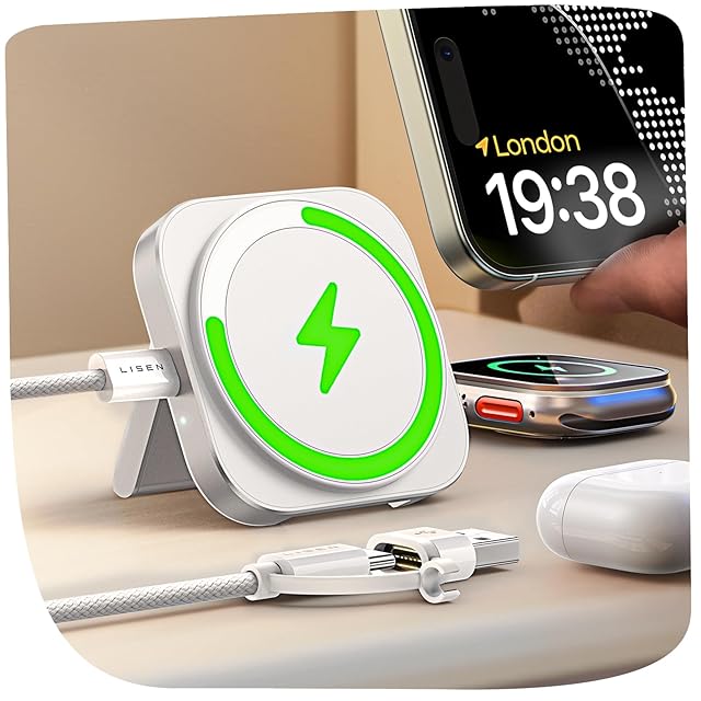 LISEN Magsafe充電器 業界極小サイズ マグセーフ充電器 2in1 スタンド 置くだけ充電 軽量 トラベル約10W/7.5W Mag safe ワイヤレス 旅行 Galaxy iPhone16 Pro Max 15/15Plus/15/14/13/12Pro/Apple Watch 10 /Airpodsに対応(白)