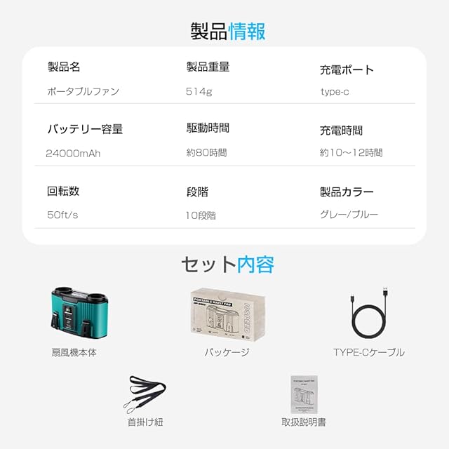【24000mAh大容量·最大80時間連続使用】USB Type-C 充電式なので、外出時にもお気軽に使用いただけます。ベルトファンは24000mAhの大容量リチウムイオンポリマー電池を内蔵しています。フル充電の場合、扇風機で最大80時間の航続が可能です(使用場合また異なる段階によって使用時間に差異があるので、ご了承ください)。USB-A5V出力を搭載しているため、携帯電話やゲーム機などの電量不足で緊急な場合に、モバイルバッテリーとして携帯電話ややゲーム機などの充電にも使えます。