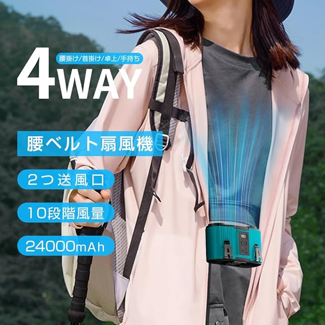 明誠 ベルトファン 腰掛け扇風機【2025年夏発売・24000mAh大容量】首掛け 卓上 手持ち 腰かけ 携帯扇風機 双風口 USB-C充電式 80時間連続稼働 10段階風速 強力風量 最大15.5m/s 両面クリップ ハンズフリー ウエストファン ブラシレスモーター採用 防塵 防汗 軍用規格 耐衝撃 LED表示画面 暑さ対策 屋外作業/アウトドア/工事/配達作業-ブルー