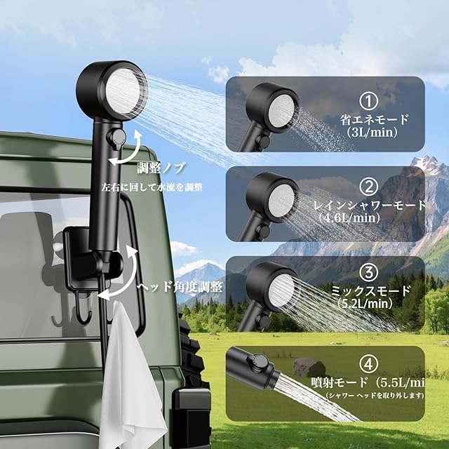 【多用途に使える4段階の水流調整可能】キャンプ用シャワーヘッドは、省エネモード、混合モード、降雨シャワーモード、と噴射モード(シャワー ヘッドを取り外す)、4つの給水モードでニーズに合わせて簡単に切り替えられます。これにより、室内外でのシャワー体験を向上させることができます。
