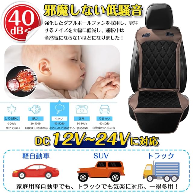 【無段階風量調節&DC12V/24V対応】シートカバーが無段階風量調節機能が搭載し、段階にこだわらなく、個々の好みや快適性に合わせてカーシートカバーの風量を微調節できます。より快適なドライブや移動を味わえます。さらに、DC12V/24Vの接続部を対応しており、普通車、軽自動車から、SUV、トラックなど大型車までも気楽に対応し、一得多用になり!
