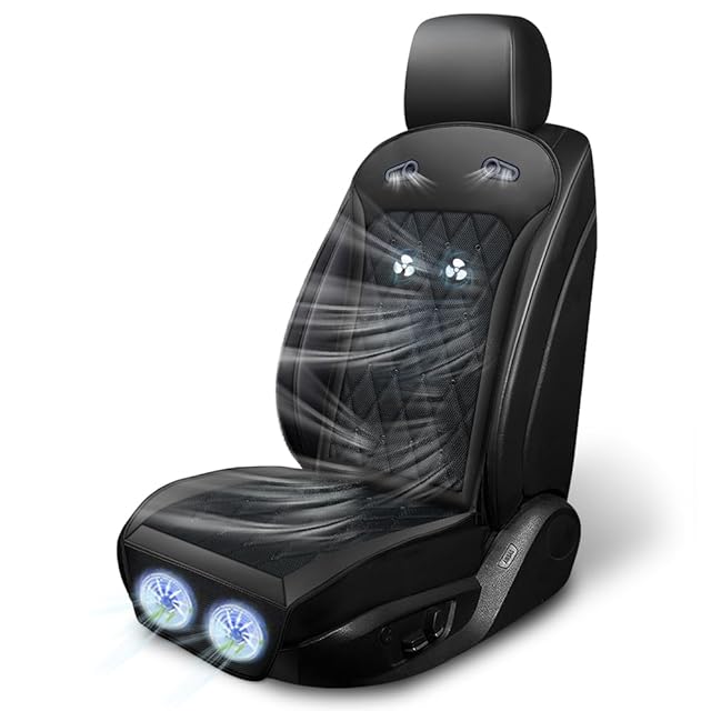 【夏のドライブの新常識!&強力ファン&パワフル送風】2025年に夏を満喫するための究極のクールシート対応策を探しました!丁寧な開発企画、ファンの数が多ければ多いほど風が通り、通気効果が良くなるという古い考えを超え、超強力デュアルボールベアリング大型ブロワーファンを作りました!シートカバー下部のファンだけで吸い込んだエアコンの冷たい空気を座面、バックさらに首元に届けます。下部に直径15cmの2個大型フアン+背部2個強力ファン、高速回転でフアンの動きによって風の抵抗を効果的に低減し、大型フアンの回転速度が8800回転/分に達し、一枚は10枚小型フアンl相当します。夏の除熱效果45%アップ!ソート構造を最適化し、冷風量が従来より倍増! さらにヘッド部の2つ吹き出し口を追加し、首までスッキリ!涼しさをつくり、蒸し暑さに別れを告げ、熱い夏でもドライブ快適♪