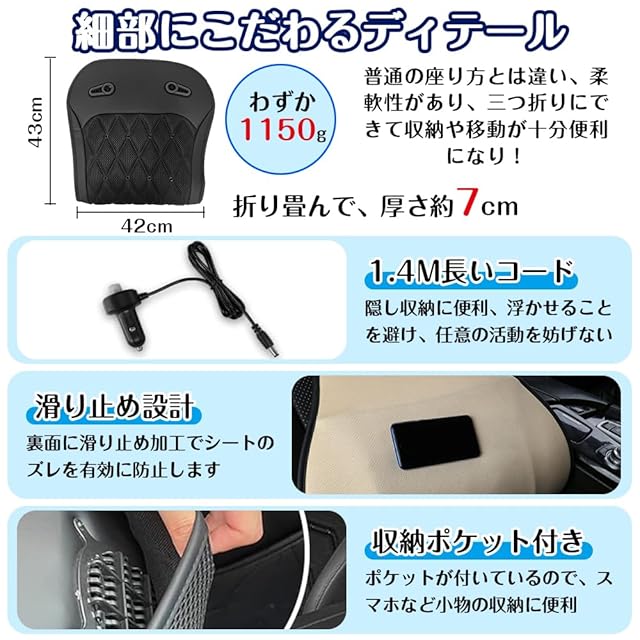 【移動/収納便利&安心】普通のクールシートと異なり、わずか1150gの重量で、さらに柔軟性のあるファンボードを使用します。収納時は三つ折りにできて、折り畳んだ後、サイズは約42*43*7cmになり、収納や移動が十分便利になります!初期不良や使用中の自然障害などの場合は交換サービスを提供する。顧客の誤使用による故障は範囲外であります。