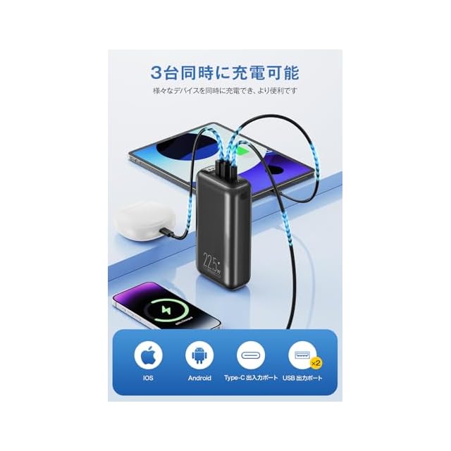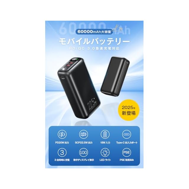 モバイルバッテリー 大容量 【2025業界設計・60000mAh大容量・22.5W/20W急速充電】 バッテリー 携帯充電器 USB-Type C入出力ポート 最大27W出力 3台同時充電 LCD残量数字表示 スマホ充電器 コンパクト 持ち運び便利 LEDライト付き PSE認証済 スマホ 全機種対応 安全回路保護 アウトドア/停電/防災緊急用 (ブラック)