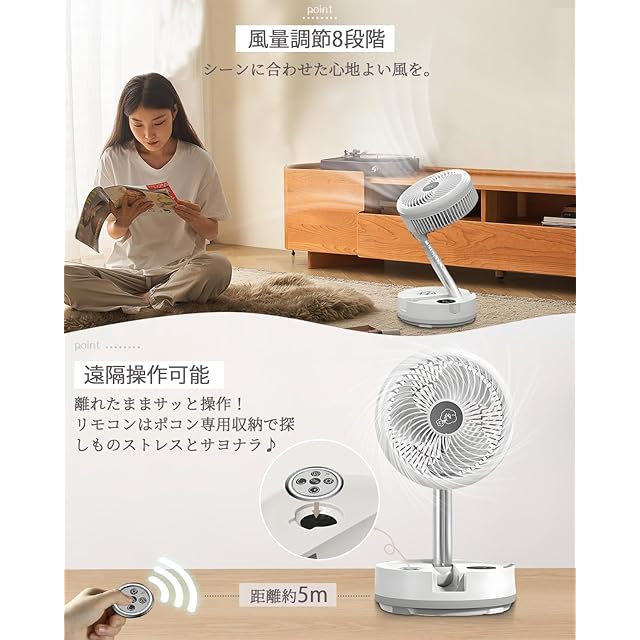 扇風機 自動首振り 充電式 40,000mA サーキュレーター コードレス リビング 伸縮式 折りたたみ リモコン付き タイマー 液晶タッチパネル 風力8段階 小型 強力送風 ポータブル 寝室 車中泊 キャンプ ホワイト