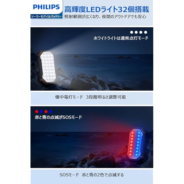 商品名:Philips(フィリップス)【ソーラー モバイルバッテリー 20000mAh】ソーラー充電器 ソーラーチャージャー 4way蓄電 大容量充電器 5ポート 入出力兼用/急速充電/高輝度 LED/SOSライト付き 耐衝撃 旅行/キャンプ/災害/非常用グッズ ios/Android 対応 PSE認証済 DLP7726N (ブラック)