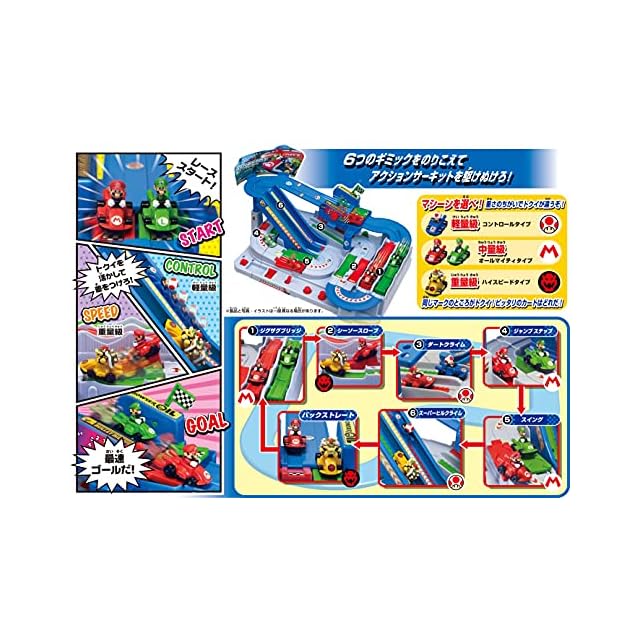 立体サーキットには6種類のアクションギミックとラップカウンターを搭載。ギミックとの相性を考えてカートを選んだり、ギミックの操作を極めたり、やり込み要素満点のアクションレースゲームです!