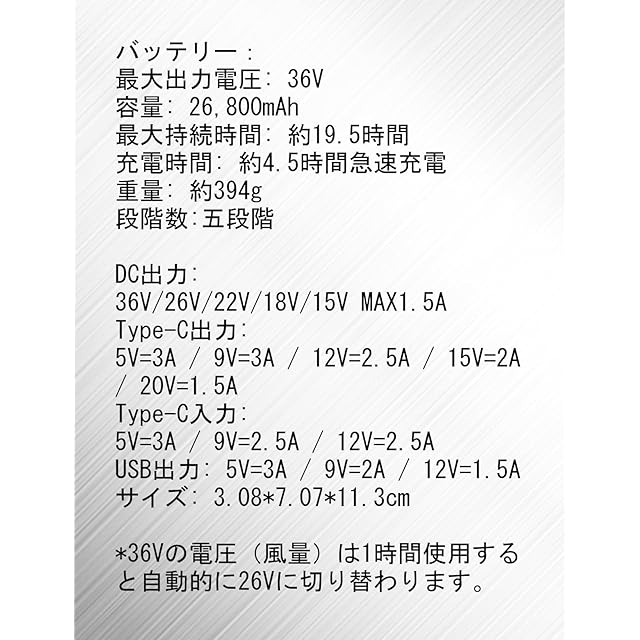 商品名:【2025最新型 36V業界超高出力 26800mAh 156L/S】LABCOOL ファンバッテリーセット ファン付きベスト用 5段階風量調節 PSE認証済 AFXBOOTS 外仕事 作業服 夏用 暑さ対策 熱中症予防