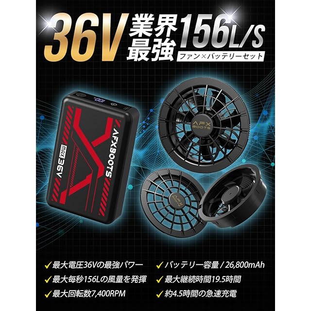 【2025最新型 36V業界超高出力 26800mAh 156L/S】LABCOOL ファンバッテリーセット ファン付きベスト用 5段階風量調節 PSE認証済 AFXBOOTS 外仕事 作業服 夏用 暑さ対策 熱中症予防