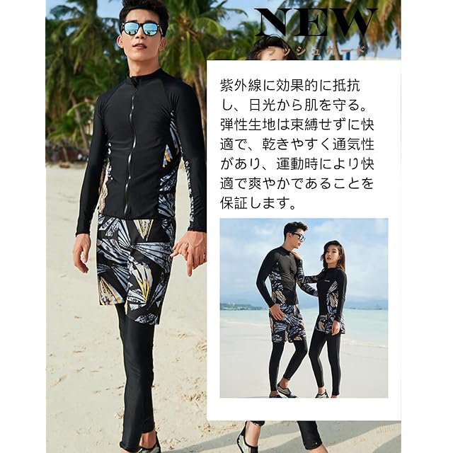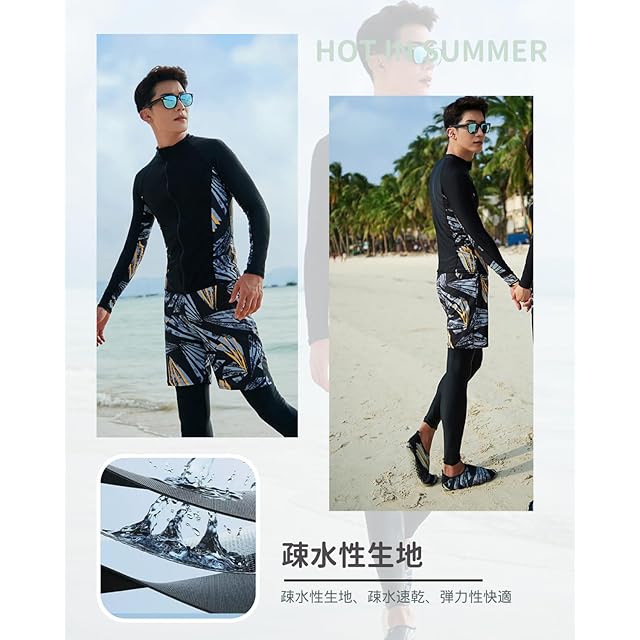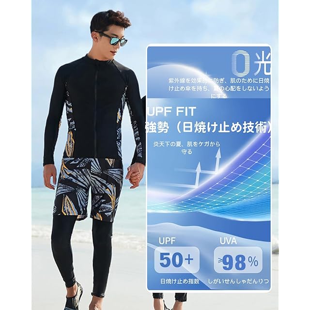 [xulee] ラッシュガード メンズ 水着 長袖 前開き サーフパンツ レギンス 3点セット ジップ アップ スイミング サーフパンツ レギンス ビーチ 水泳パンツ 温泉 通気性 [UVカット UPF50+・吸汗速乾] フィットネス 水陸両用 2011-2XL