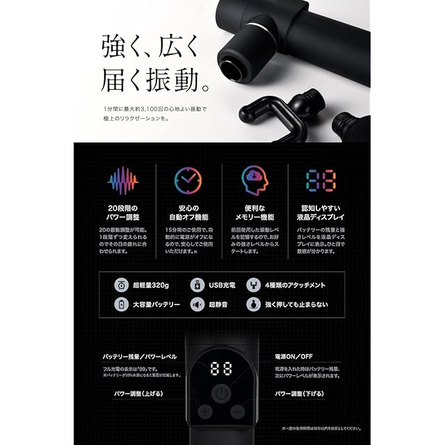 ✅【4種類のアタッチメント】 「球形」肩・二の腕・背中・腰・太もも・太もも裏など大きな筋肉に。 「円柱形」手のひら・足裏などピンポイントを刺激したいときに。 「U字形」腕・すね・足首など細めの筋肉に。 「平形」ふくらはぎをはじめ、あらゆる部位に。 【大容量バッテリー】 充電時間は約3.5時間で、約3〜4時間使用可能 ※本製品の使用頻度や使用レベルによって異なります。 ※バッテリーの寿命を保護するためにバッテリーが切れるまで充電しないでください。 ※USB-Cケーブルは必ず付属のケーブルをご使用ください。 ※製品の安全上、充電中はご使用いただけません。※初めての充電時や長期間使用しなかった場合、充電時間や使用時間が目安と大きく異る場合がありますが、通常何度か充電や使用を繰り返すと正常に戻ります 。※本製品到着時、本体は充電されておりませんので満充電してからご使用ください。