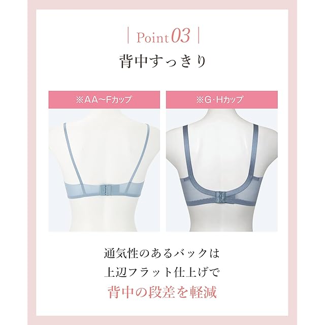 【快適なつけごこち】カップはクッション性のあるやわらかなウレタン素材でバストになじみやすい【背中すっきり】通気性のあるバックは上辺フラット仕上げで背中の段差を軽減