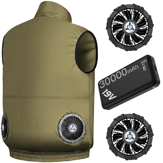 [Sumeriy] ファン付き作業服 ウェア ベスト 30000mAhバッテリ付き 19V超高出力 空調作業服 4段階風速調節 超長連続使用時間 大風量 USB給電式 UVカット 暑さ対策 熱中症予防 屋外作業 在宅 通勤 男女兼用 (L, カーキ)