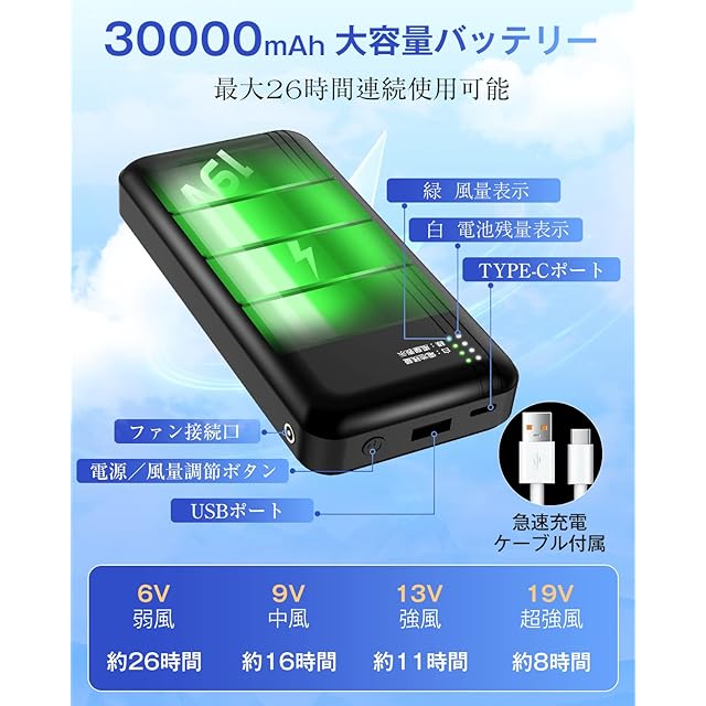 【30000mAh大容量バッテリー】Sumeriyファン付き作業服は今年いよいよグレードアップして再登場!30000mAhの大容量バッテリー、クイックチャージケーブル付属、最長26時間連続稼働可能、最大出力電圧19Vです。風量、使用寿命は市販のものを圧倒的に上回り、夏バテの悩みを徹底的に解決してくれます。