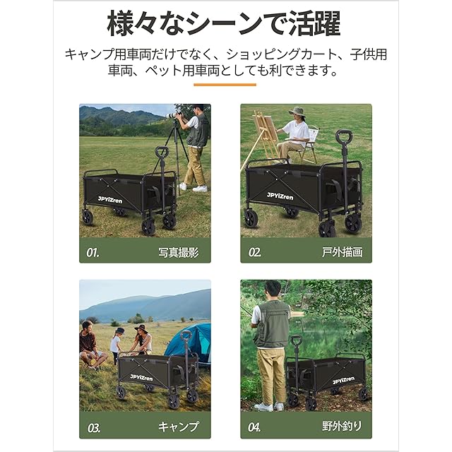 幅広く活躍:アウトドアキャンプだけでなく、買い物時のショッピングカートとしてや、屋外を歩く際にはベビーカーやペットカートとしても利用できます。その洗練されたデザインは、さまざまなシーンで活躍します。フレーム、ホイール、布は簡単に取り外せるので、メンテナンスやクリーニングも手軽に行え、常に清潔に保つことができます