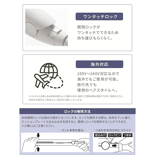 ✅【 31段階 温度設定 】80℃~230℃まで5℃間隔で30段階の設定が可能。スピードヒーター搭載で忙しい朝でもあっという間に使用可能温度に到達します。温度上昇確認モニターで1℃ずつ温度上昇を確認できて便利! サロン用 として プロ の 美容師 さんにも 人気 です。 ✅【 海外対応 】100V~240Vまで対応しているので、海外 でも使用できます。※変換プラグはご用意ください。✅【 持ち運び にも】ロック機能搭載で コンパクト に 収納 ができます。旅行 などの持ち運び にも便利です。
