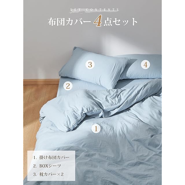 クモリ(Kumori)寝具カバーセット 布団カバーセット 洗いざらし シワ加工 水洗い やわらか (掛け布団カバー ボックスシーツ 枕カバー)吸水速乾 丸洗いOK 肌に優しい 洗える 無地 シンプル オールシーズン(ダブル・4点セット ブルー)