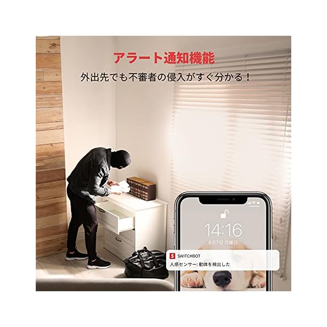 【アラート通知機能】不審者が侵入すれば、スマホに通知が届きます。SwitchBot屋内カメラと一緒に使用すれば、不審者を検知したら、自動的に写真を撮ったり、録画をしたリし始めます。