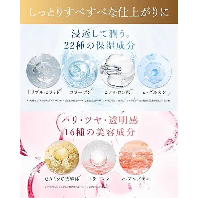 ?【美容(保湿)成分が浸透】肌を潤いで満たすトリプルセラミド(セラミドNP NG AP)やコラーゲン、ヒアルロン酸を配合。さらにビタミンC誘導体やフラーレンなど年齢肌にも嬉しい計38種の美容(保湿)成分を贅沢補給。(※浸透 角層まで)