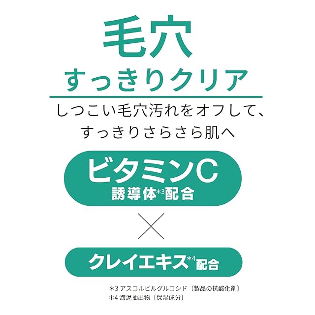 ?【ビタミンC誘導体*1×クレイエキス*2配合】気になる皮脂や毛穴の黒ずみ*3をケアして、毛穴の目立たないなめらかな肌*4にととのえます。(*1 アスコルビルグルコシド〔製品の抗酸化剤〕 *2 海泥抽出物〔保湿成分〕 *3 古い角質 *4 汚れを落とすことによる肌印象)