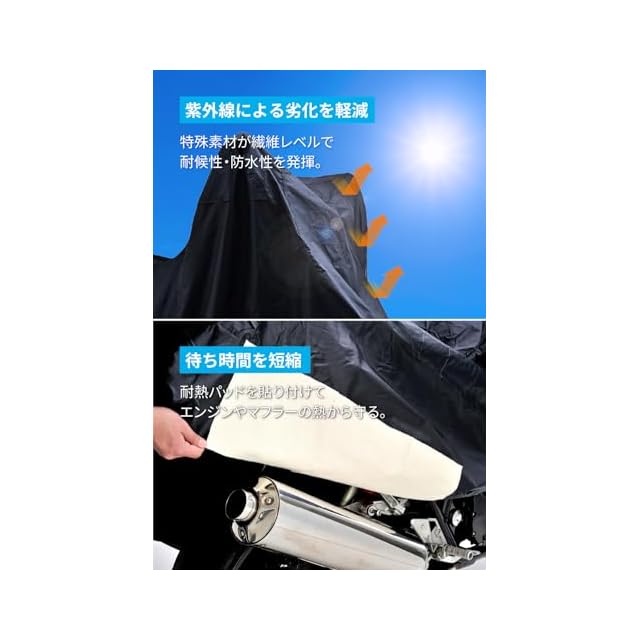 【仕様3】エキゾースト接触部には付属の耐熱パッドをバイクカバー内に張り付けて対応