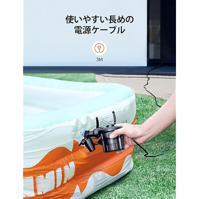【精巧な外形と簡単な操作】:プール 空気入れは新しい高強度ABSプラスチックの材料を採用されました。ユニークな形状がより良い体験を提供します。ON/OFFボタンのデザインは対象を充填したり、しぼませたりするのは便利で、操作するのに役立ちます。
