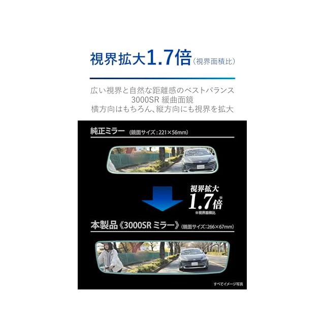●視界拡大 1.7倍 横方向はもちろん縦方向にも視界を広げる3000SR緩曲面鏡が、ゆとりのあるドライビングに貢献します。