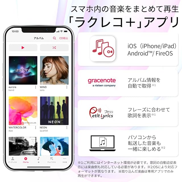 【動作環境】iPhone/iPad/iPod touch、Android、Fireタブレット、ウォークマン(NW-A100シリーズ、NW-ZX500シリーズ)対応OS:?iOS,iPadOS,Android,FireOS ※対応OSはアプリに依存。取り込んだ音楽は「ラクレコ+」アプリでのみ再生可能。