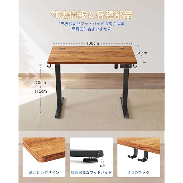 YIHAYO 昇降デスク 高さ70-115cm 幅100cm 奥行き60cm 電動 スタンディングデスク 昇降式デスク 高さメモリー機能 上下自動昇降 静音 収納フック付き 組み立て簡単 パソコンデスク ワークデスク オフィスデスク ブラックフレーム/ブラウン天板